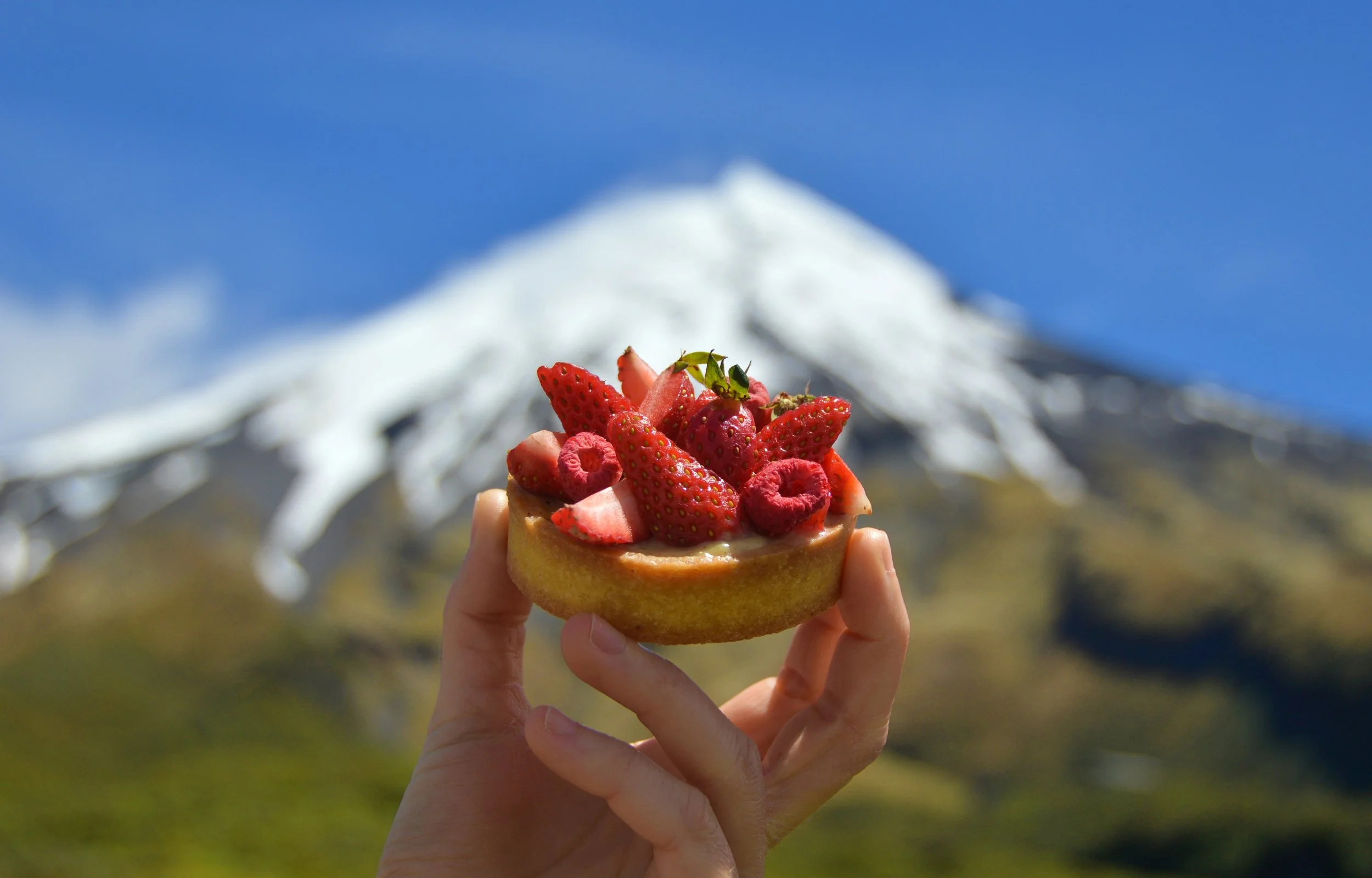 Tiphaine's hand holding a vanilla and berry tart in front of Mt Taranaki, NZ