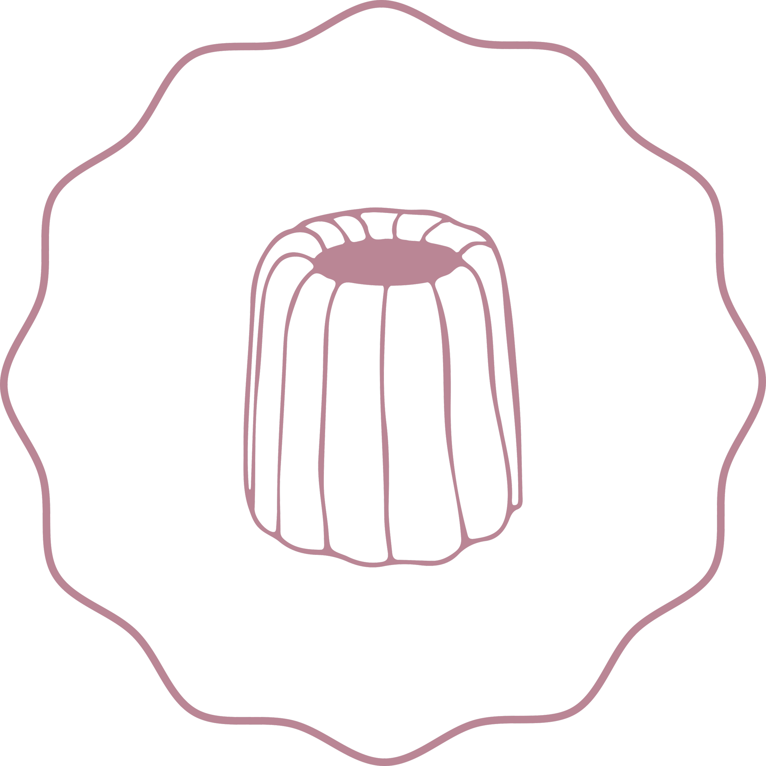Stylised illustration of a Canelé inside a scalloped lavender coloured border.